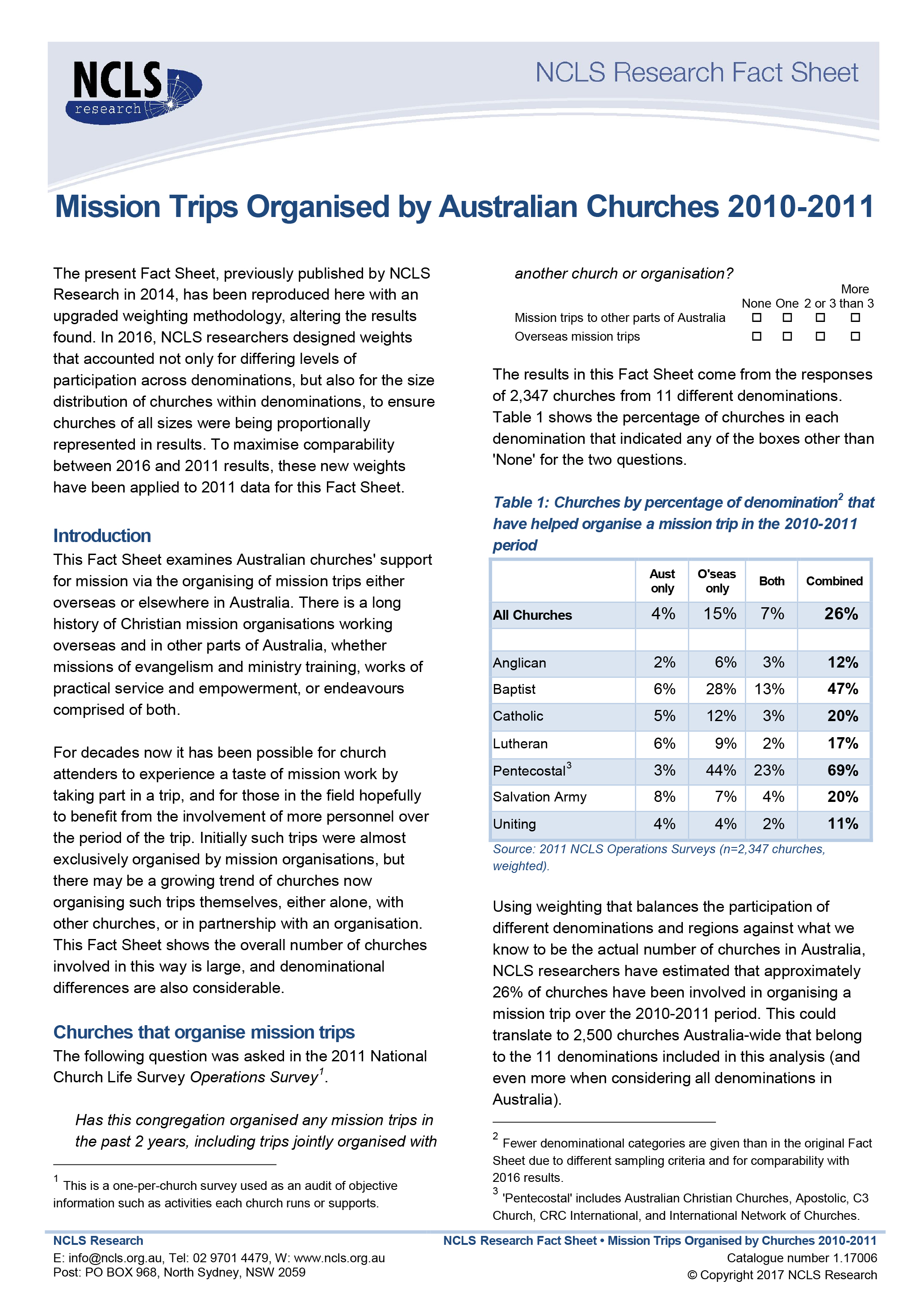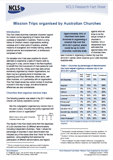There are more than 20 major Christian denominations and movements in Australia: Catholic, Pentecostal, Anglican, Uniting, Baptist, Salvation Army and more. Many of these denominations and movements are research partners  with NCLS Research.   Each receive their own customised research findings.