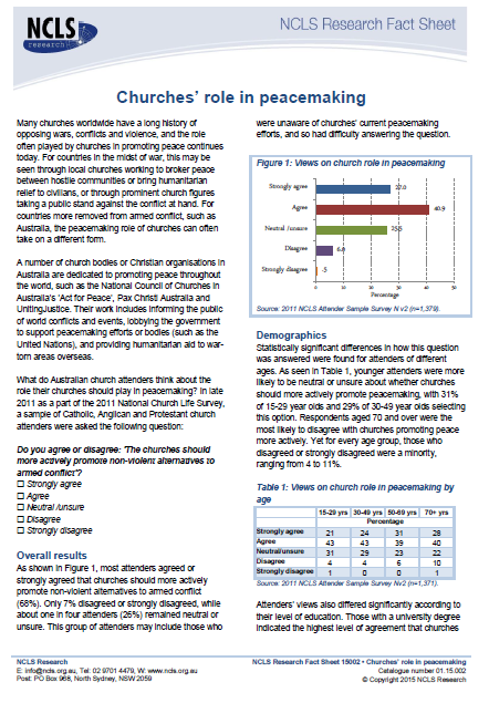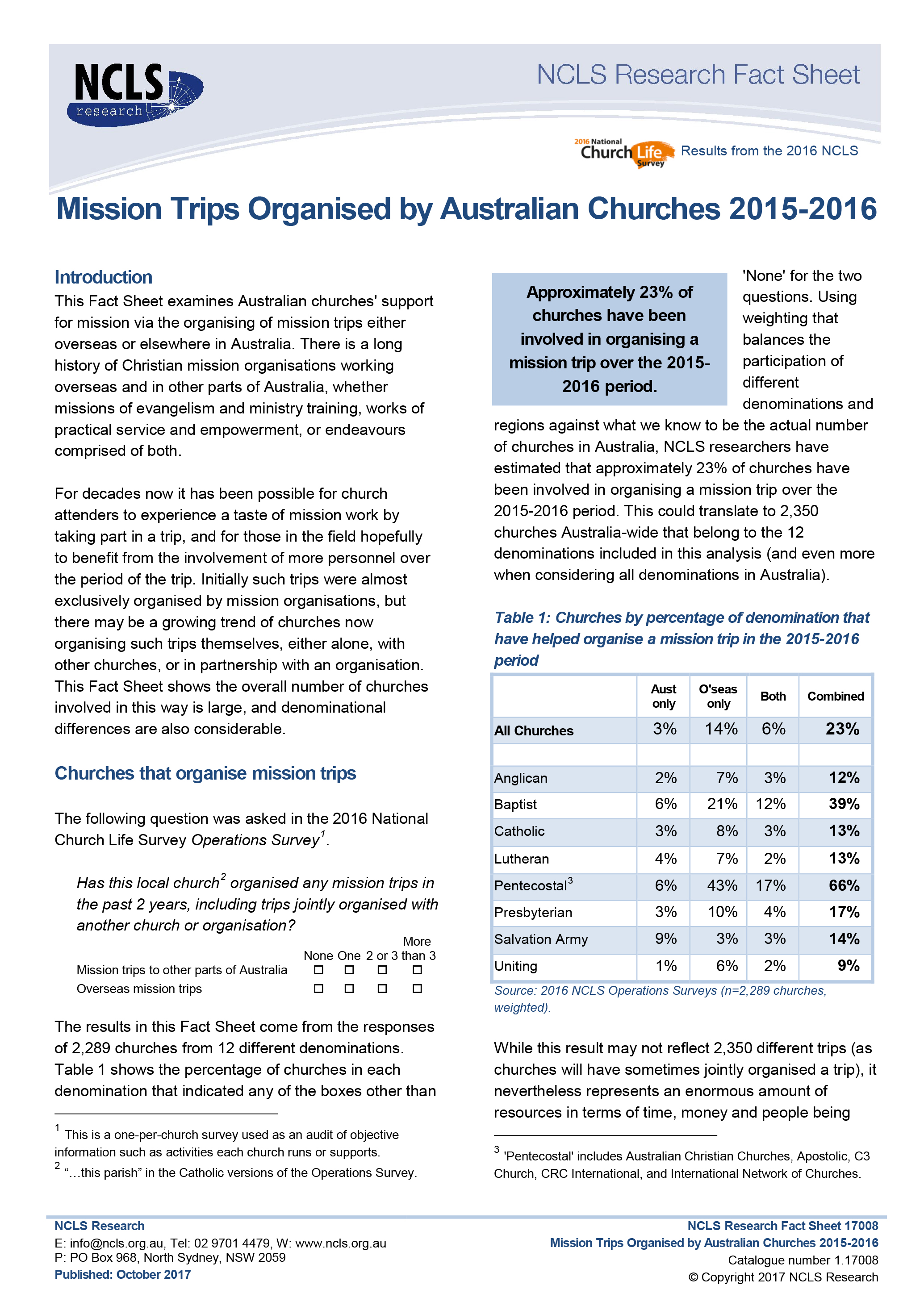 There are more than 20 major Christian denominations and movements in Australia: Catholic, Pentecostal, Anglican, Uniting, Baptist, Salvation Army and more. Many of these denominations and movements are research partners  with NCLS Research.   Each receive their own customised research findings.